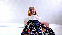 Cherry English is sat on her brown leather sofa, she is wearing a short sleeved white cotton button up blouse and a short flowing floral patterned skirt which could easily blow up. Fancy a peek at her knickers?