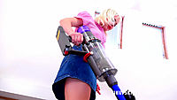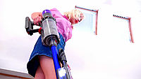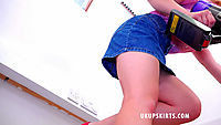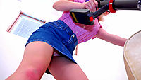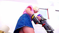 Cherry English is wearing a pink blouse and short blue denim mini skirt. The skirt is so short that it just encourages our eyes to focus on the hem and drop ourselves a little lower in the hope of seeing her white full back nylon panties. She knows we are watching